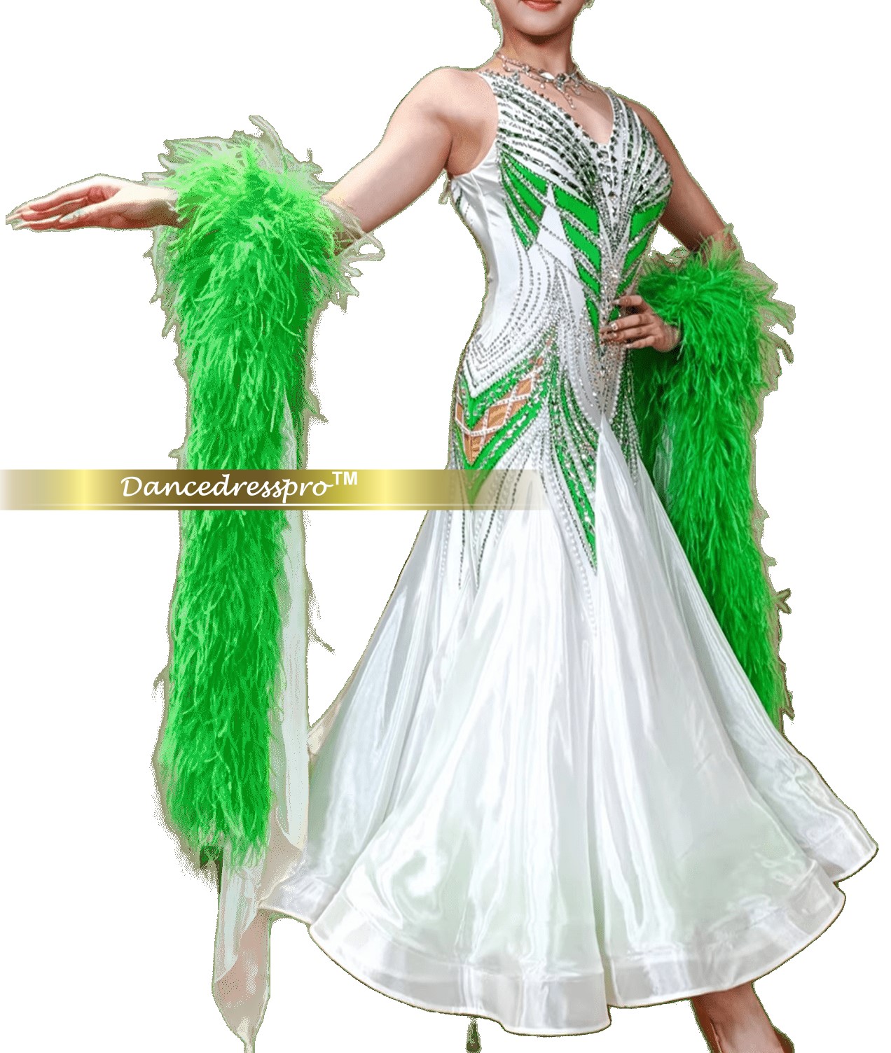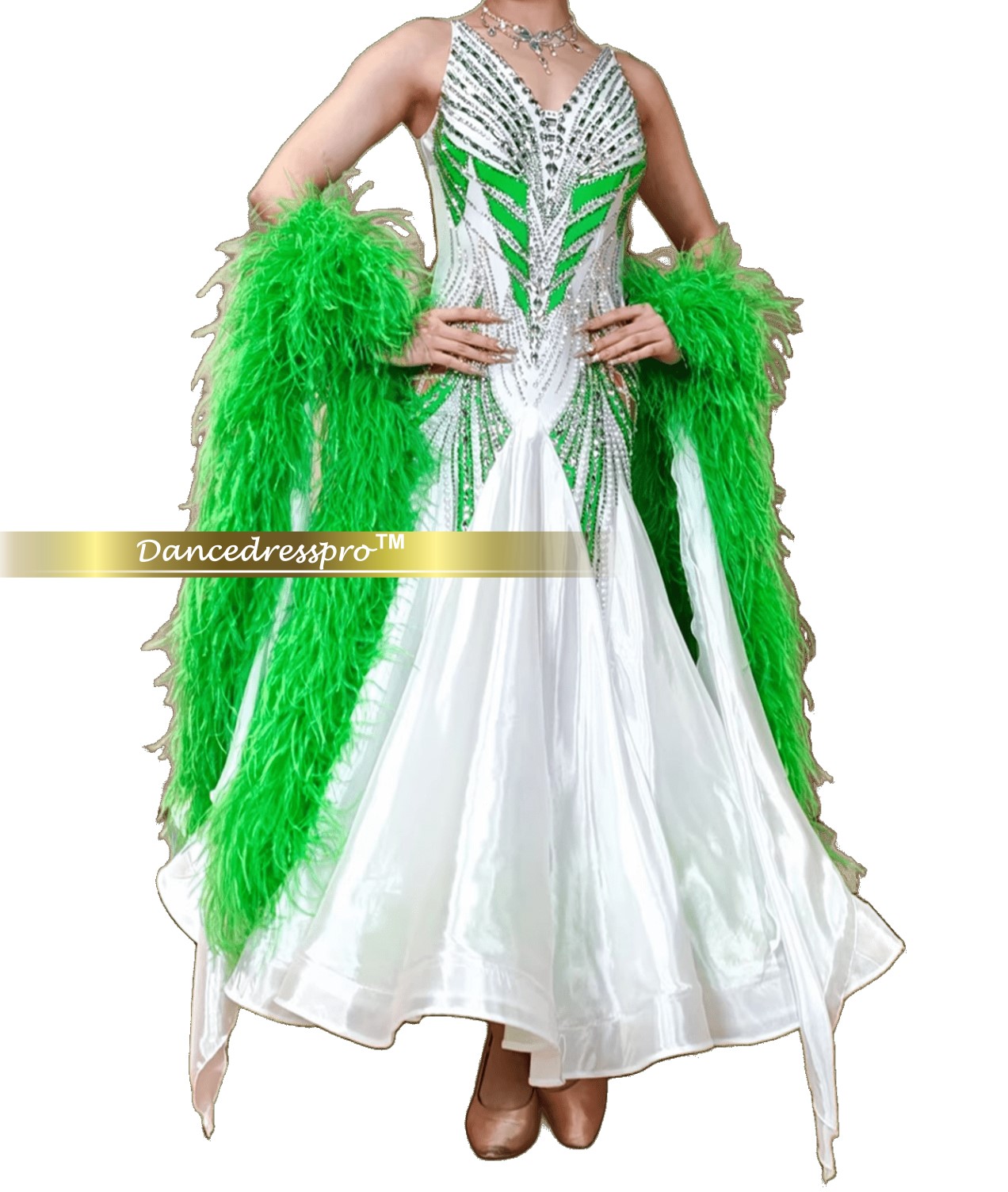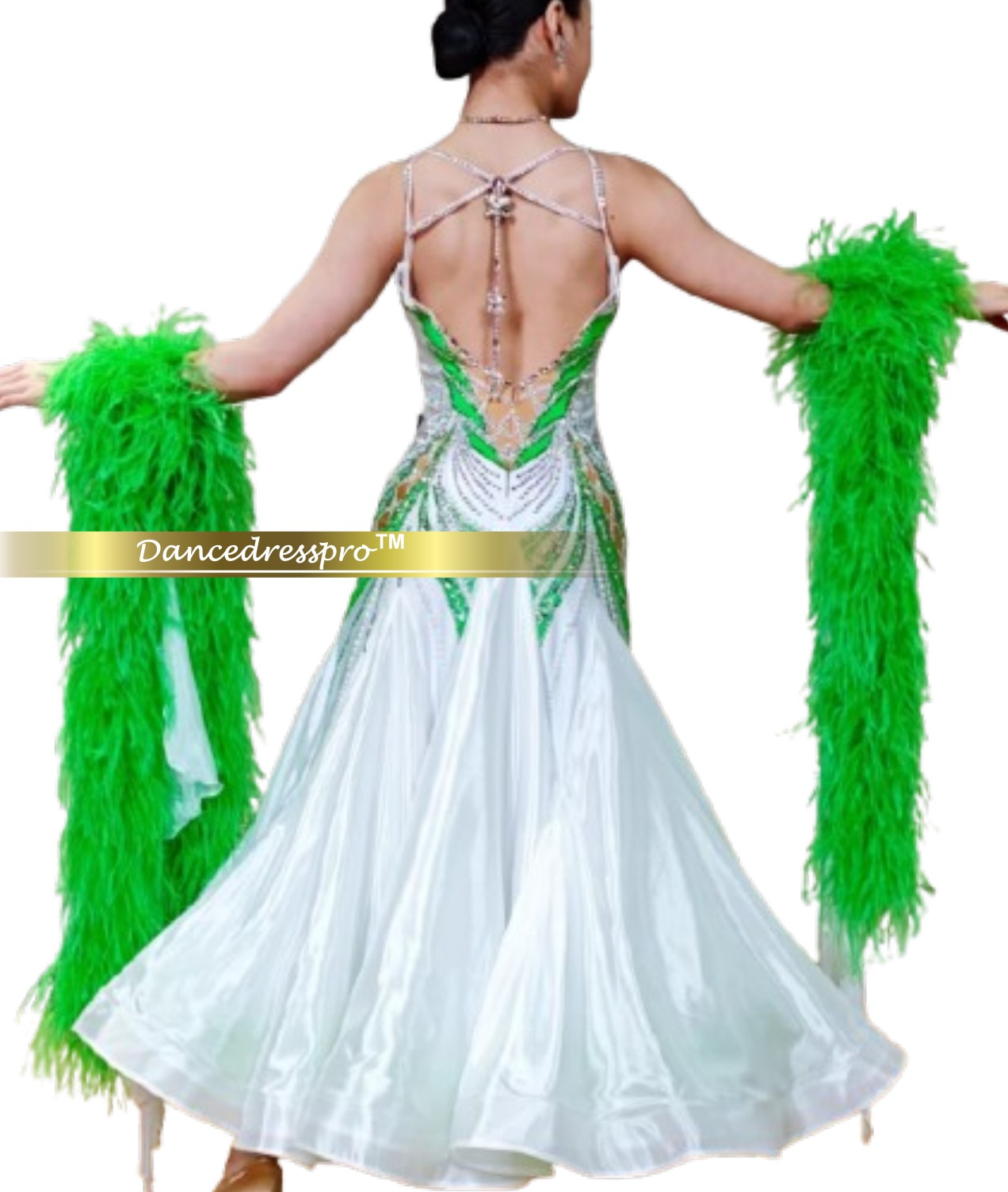 Since all dance gowns are hand-made, and the size of each customer is different, the final appearance might vary slightly from the display images. Our designers will determine during production so as to get the best effect.